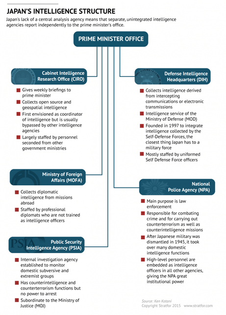 Le Japon emmailloté par un problème juridique international créé par les Américains pourrait instaurer une réforme constitutionnelle. En faisant preuve de pragmatisme, le gouvernement, face à une agression directe, menacerait l’équilibre de la paix si fragile dans cette région, à tout moment. Les services secrets japonais sont parmi les meilleurs du monde, mais ils doivent s’adapter en fonction des problèmes actuels dus à l’évolution des pouvoirs politiques et des nombreuses menaces.